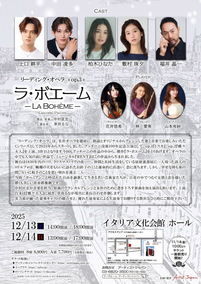 2025年12月13日(土)・14日(日)イタリア文化会館ホールにて、リーディング・オペラOp.3『ラ・ボエーム』が上演される。
